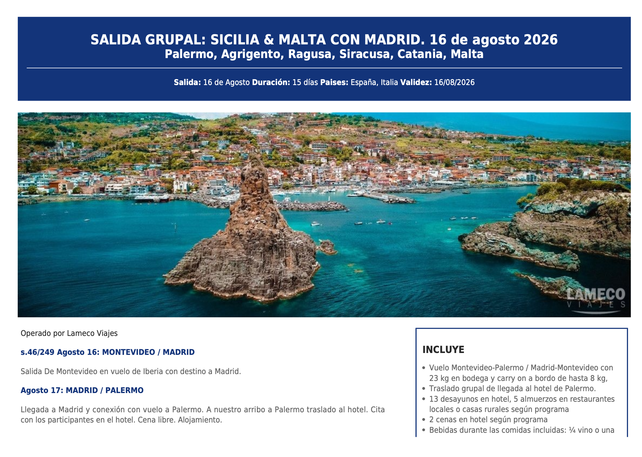 SALIDA GRUPAL: SICILIA & MALTA CON MADRID. 16 de agosto 2026